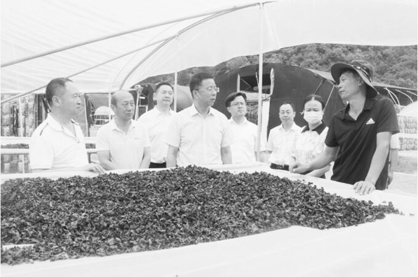 省供销社党组成员、理事会副主任王会权(左四)一行到柞水县金米村木耳种植基地观摩。 本报讯(记者 黄敏)6月22日,全省供销合作社系统高质量发展业务暨财务统计工作培训班在柞水正式开班,省供销社党组成员、理事会副主任王会权出席开班仪式并讲话。