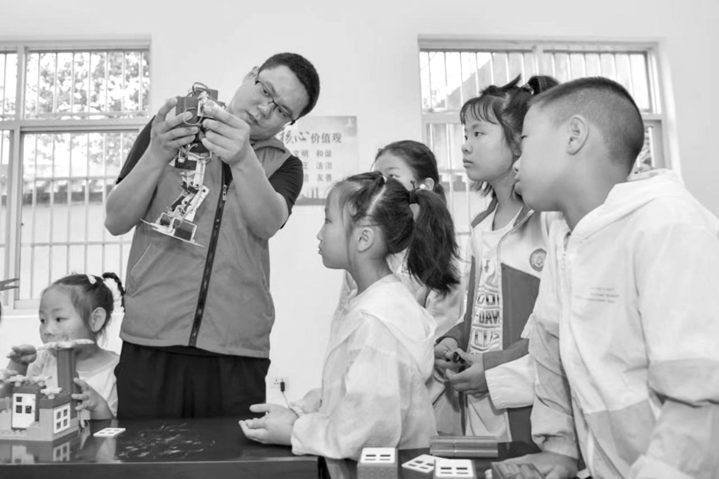 7月22日,由铜川市耀州区青年志愿者协会组织的“走进科技 拥抱未来”新时代文明实践志愿服务项目走进全国文明村——耀州区锦阳路街道张郝村,为30余名乡村儿童带来了创意积木搭建、编队无人机、关节舞蹈机器人表演等科技科创体验,点亮孩子们的科技梦想。图为志愿者在给孩子们讲解创意积木搭建的技巧。 通讯员 阎新红 石铜钢 记者 王根平 摄