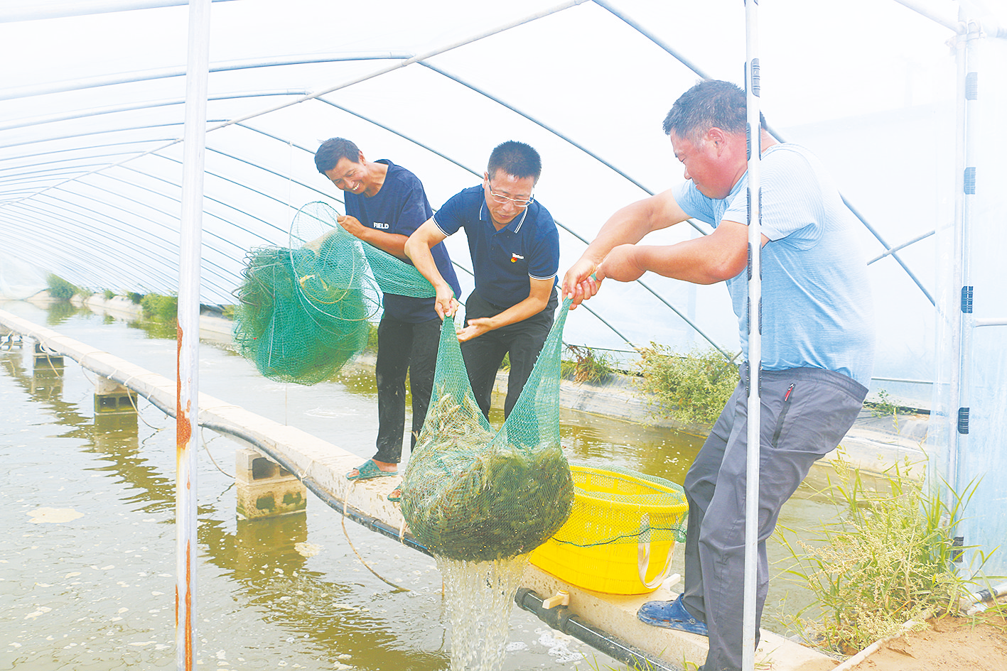 一座座大棚鳞次栉比,一池池淡水碧波荡漾,一只只白对虾自由穿梭……7月21日,蒲城县陈庄镇富新村南美白对虾繁育养殖基地,一条条兜满白对虾的“地笼”刚一拖出水面,马上就被上门等候的购商们“盯”着装筐、过磅、入箱。