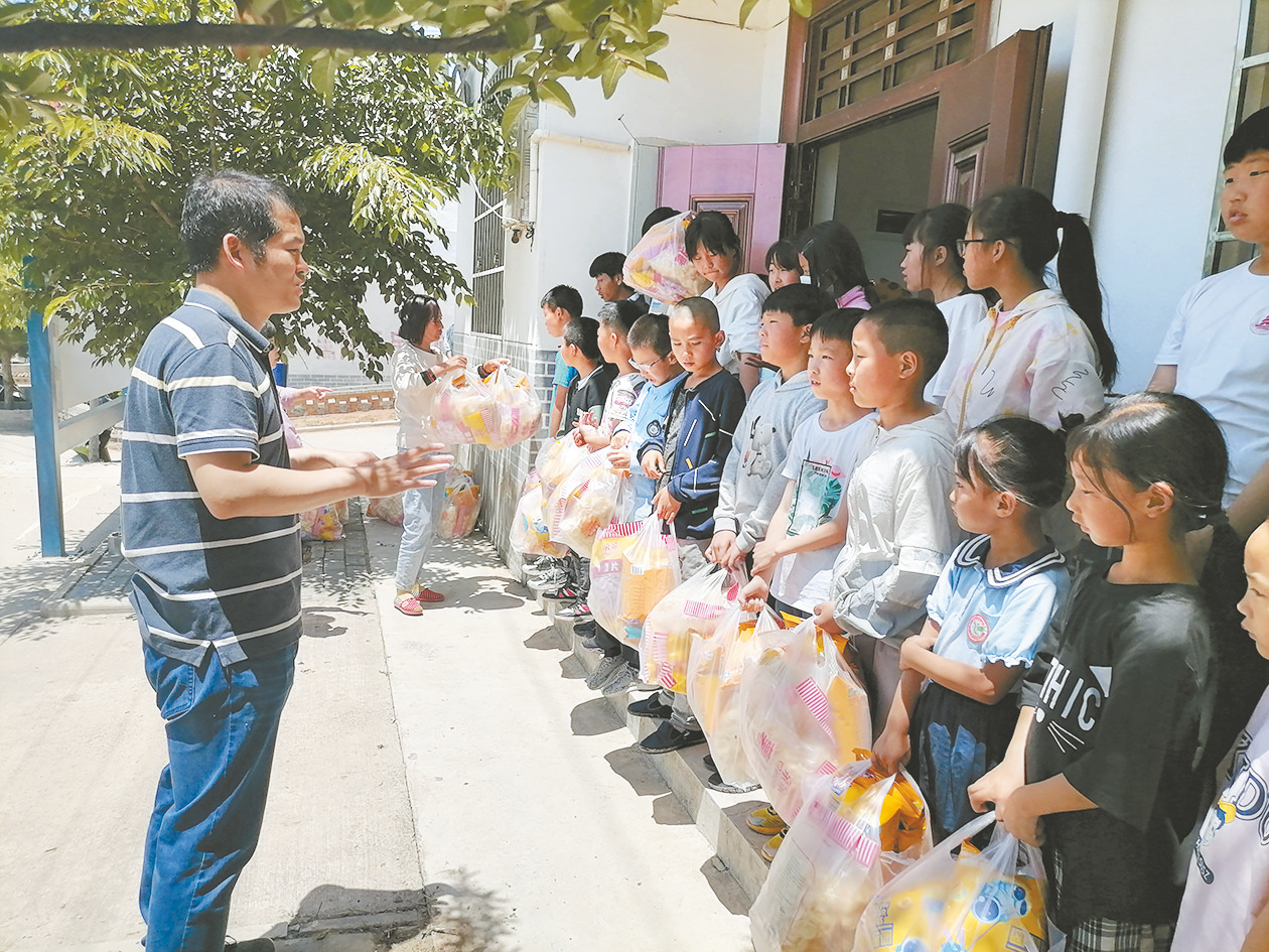 今年“六一”前夕,张亮(左)在小葵花少年宫前给孩子们发放节日礼物。 本报记者 赖雅芬 文/图