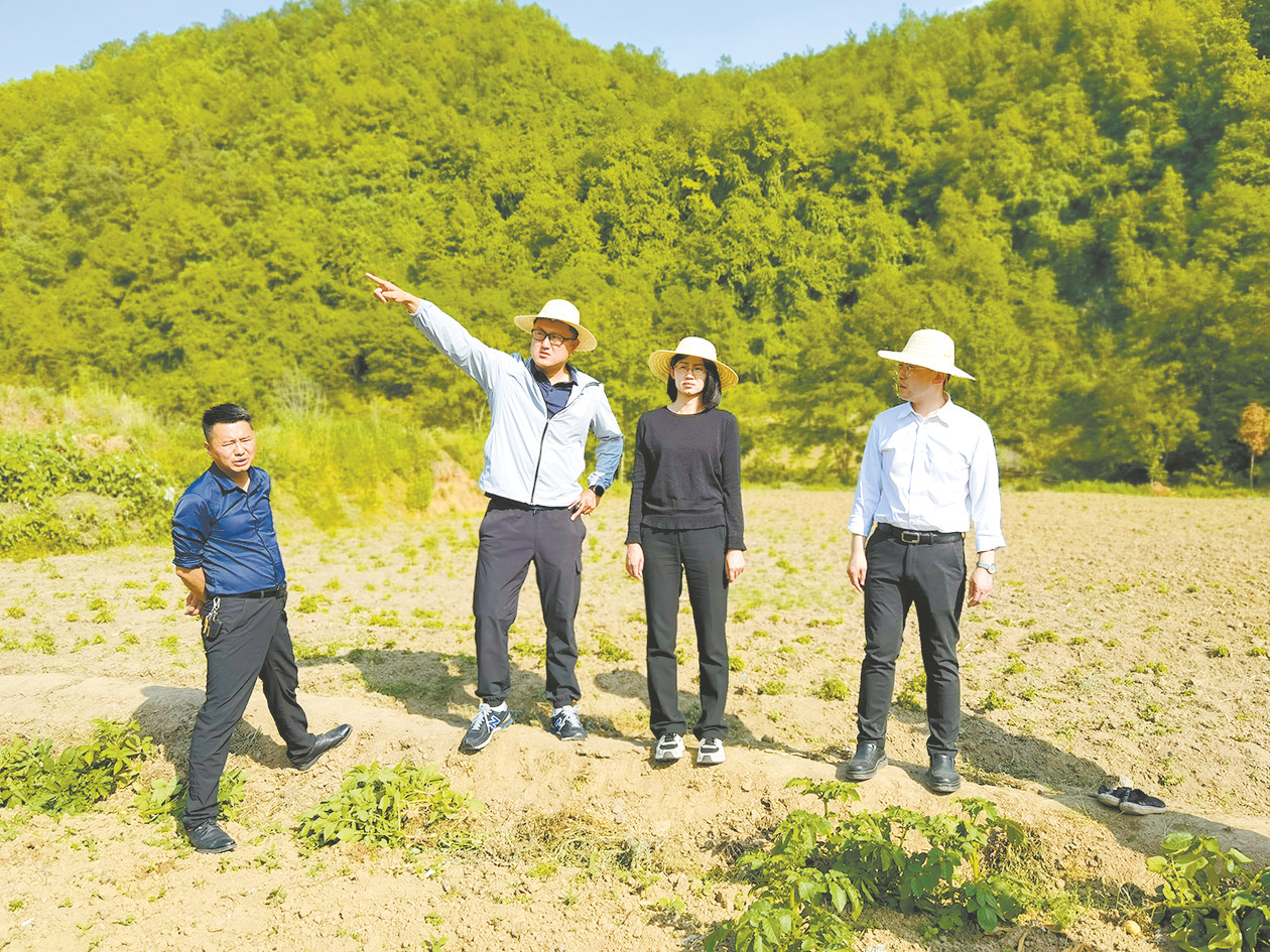 在汉滨区县河镇财梁社区绞股蓝产业园区,郝屹(左二)给参观者介绍“高低海拔差试验田”种植情况及未来智慧农业布局规划。