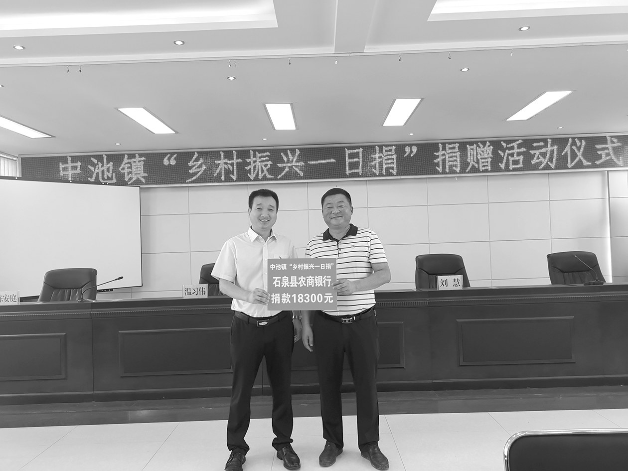 石泉农商银行参加中池镇“乡村振兴一日捐”捐赠活动,并现场向中池镇捐赠一万八千三百元。 本报记者 赖雅芬 通讯员 郝霞 文/图