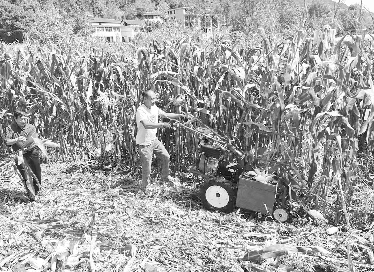 9月23日,在宁强县巴山镇石坝子村的玉米地里,村民正在使用手推式玉米单行收获机收割玉米。