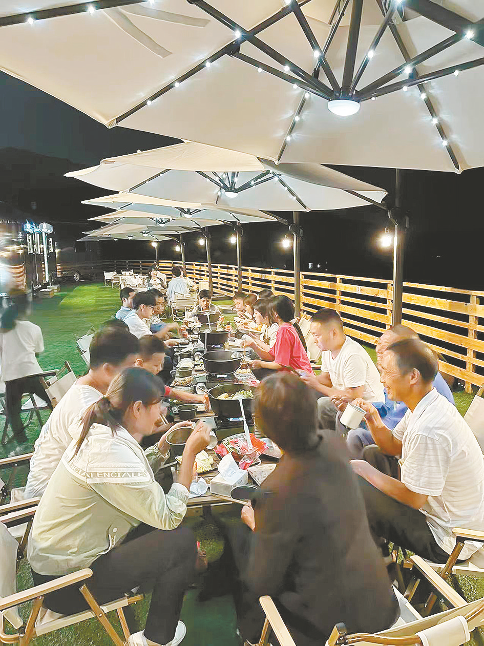 1 特色民宿添活力 九月的乔村处处都是风景,吸引了一拨接一拨的游客。9月18日傍晚,乔村一天的热闹还没有结束,民宿兰草书屋前的露营地已经灯火通明,游客们聚餐、唱歌、聊天,小孩子穿梭其间嬉笑打闹。欢声笑语打破了乡村的宁静,以往单调的乡村夜晚变得热闹非凡。
