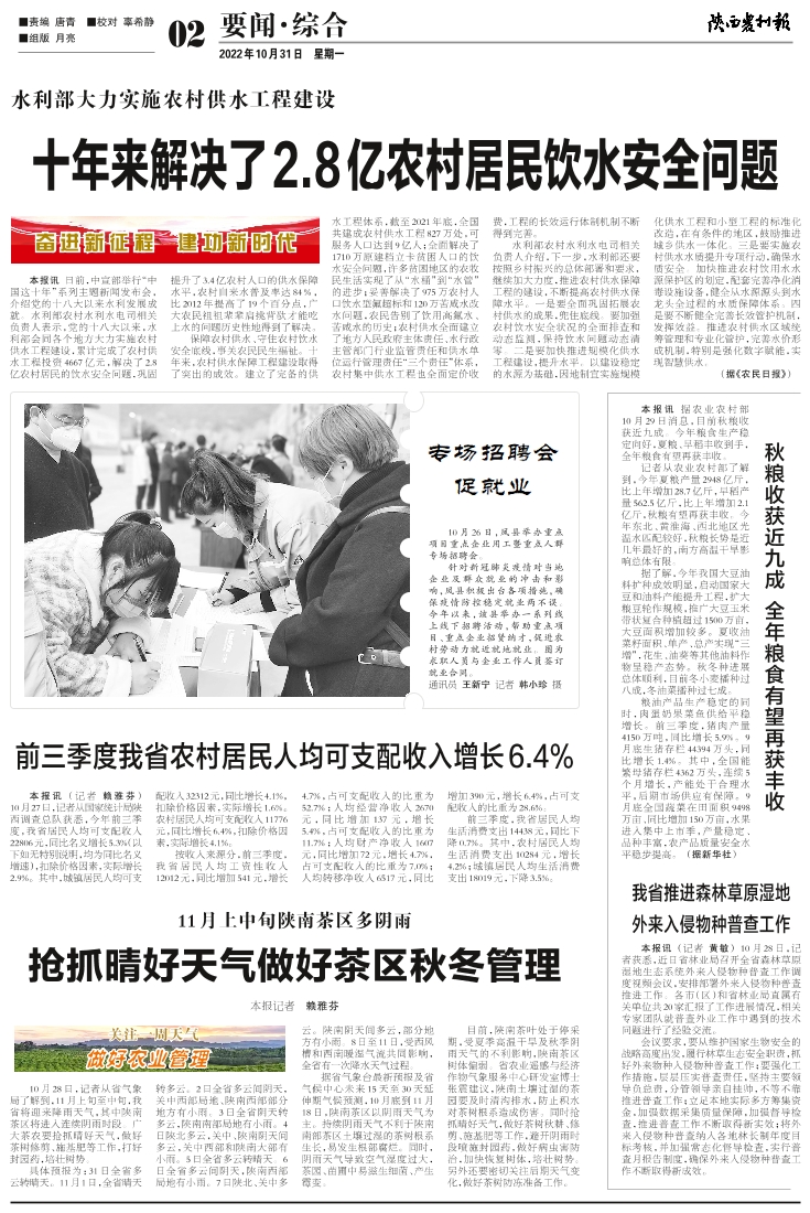前三季度我省农村居民人均可支配收入增长6.4%