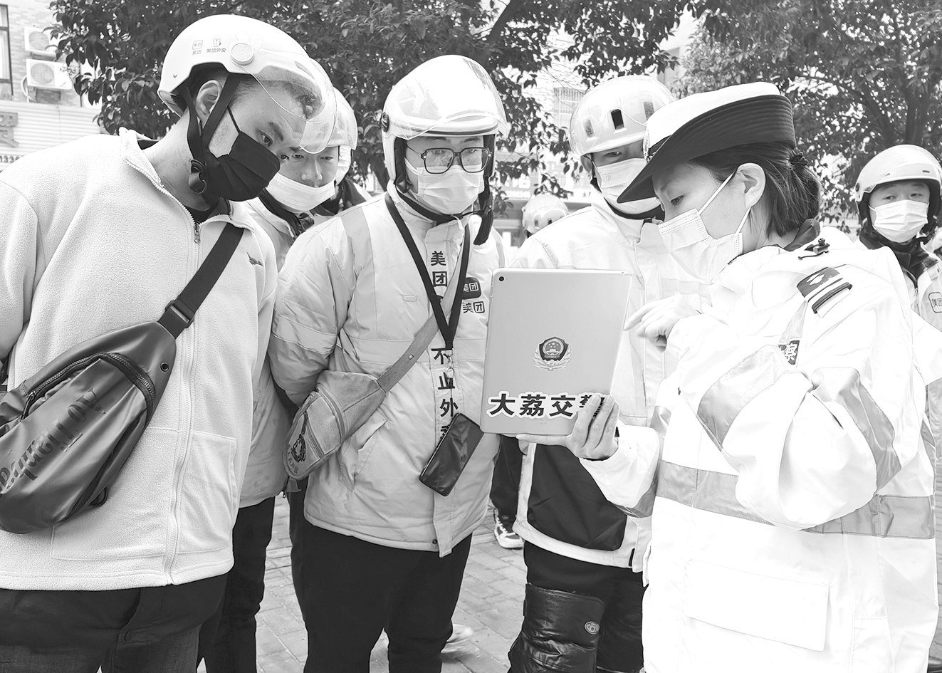 民警通过发放“一盔一带”文明交通行动倡议书、观看交通安全警示教育片、学习交通安全法规等,引导外卖行业从业人员在送餐过程中遵守道路交通法律法规,严禁未按规定佩戴头盔、酒后驾驶、闯红灯、超速、随意变道等违法行为,做到文明礼让、安全行车,杜绝不安全、不文明交通违法行为,做文明交通参与者。通讯员 李世居 韩丽娜 摄