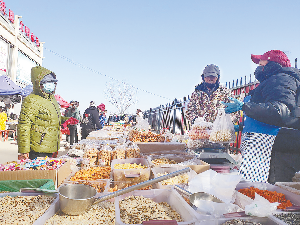 “这瓜子啥味儿啊?能尝尝不?”“尽管尝!好吃再买!”花生、瓜子等炒货摊位前,群众抓起几颗瓜子尝鲜。