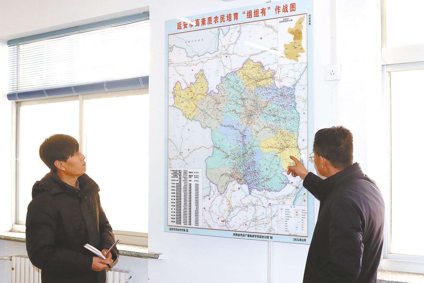 本报记者杨磊(左)在基层采访中。 延安报道组 杨磊