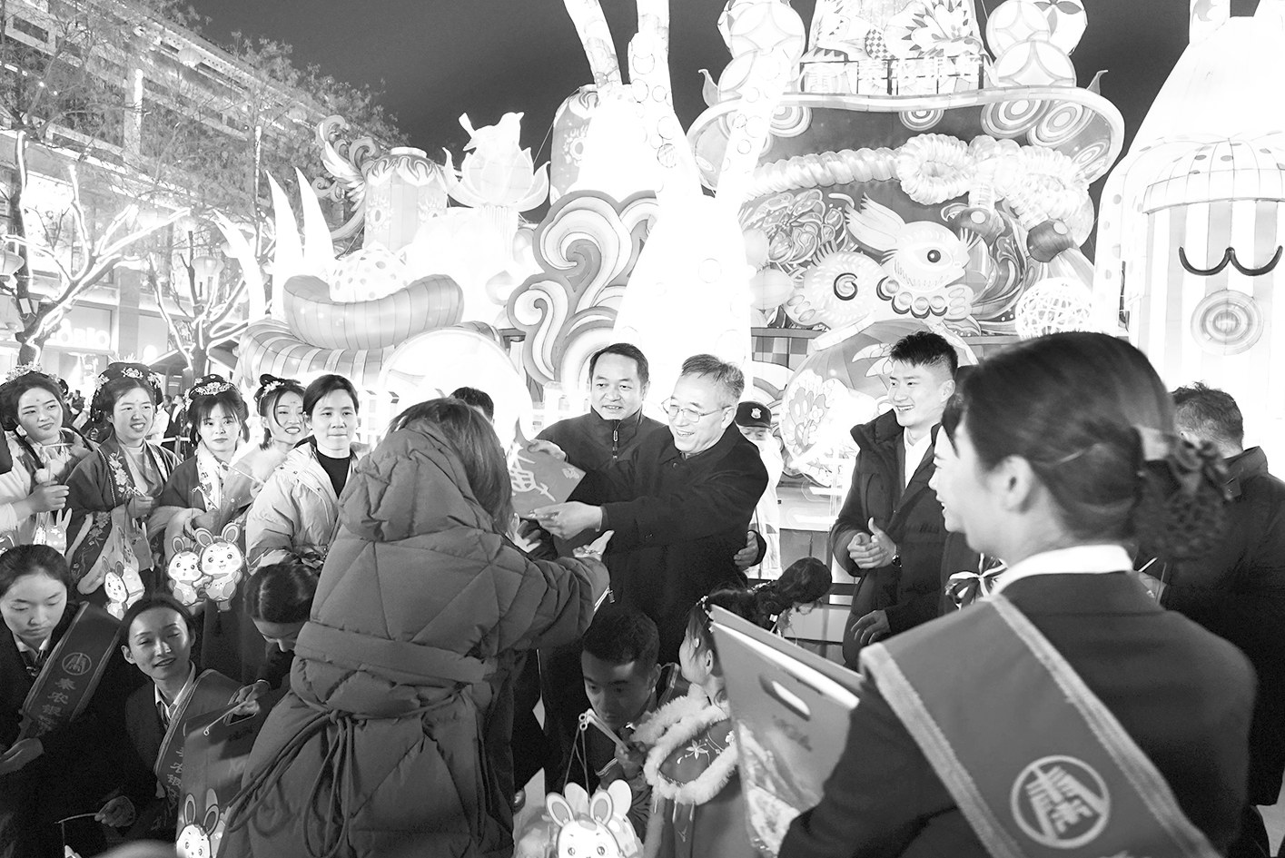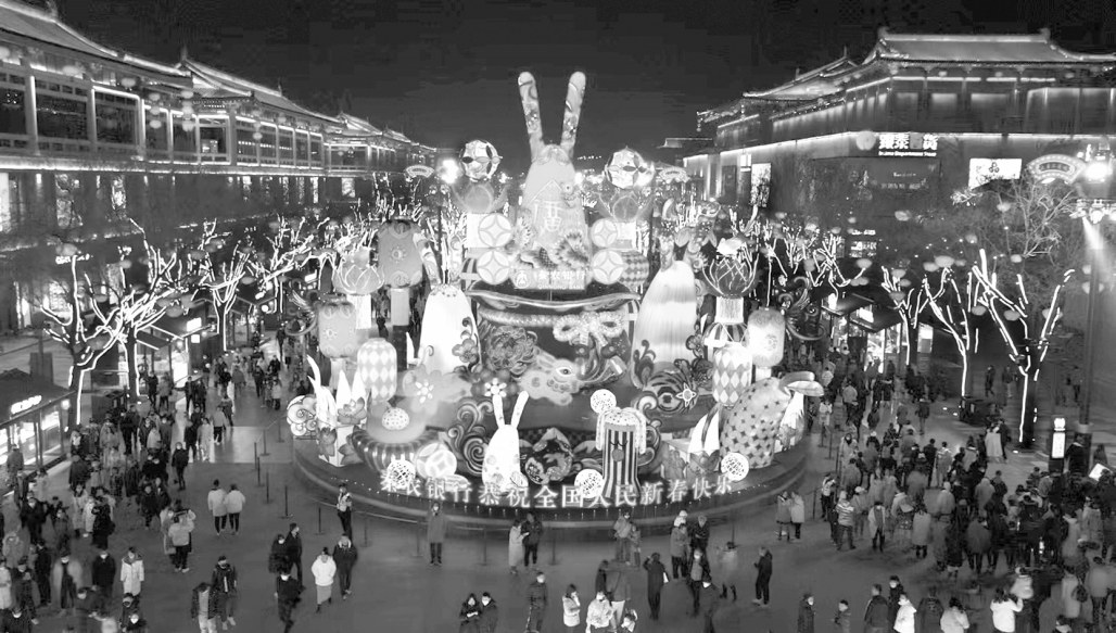2 花灯荣登央视 点亮文化底色 春节期间,大唐不夜城灯火彻夜不息,各色花灯在人群中熠熠生辉。其中由秦农银行冠名的主灯“东方兔仔”将甲骨“福”文与当代艺术相融合,其独特的设计理念,让它备受关注,该创意一周内三次荣登中央《新闻联播》。截至2023年1月28日,大唐不夜城步行街累计接待361.83万人(次)途经“东方兔仔”主灯进行赏灯。