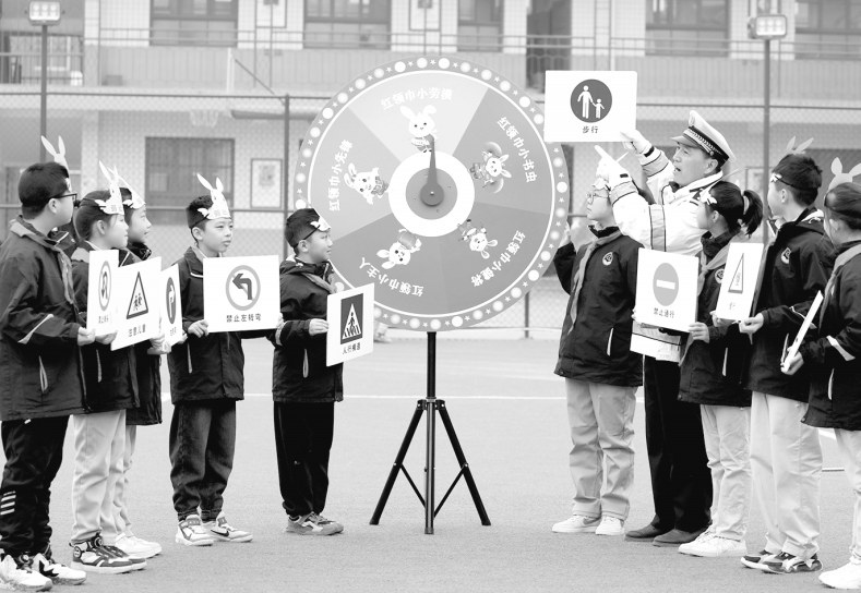 在北塘实验小学,民警在操场上、教室里与孩子们开展互动游戏,引导他们识别交通标志,了解交通标志的实际作用。通过学习,让孩子们注意观察家长的驾驶习惯,提醒家长守法出行。