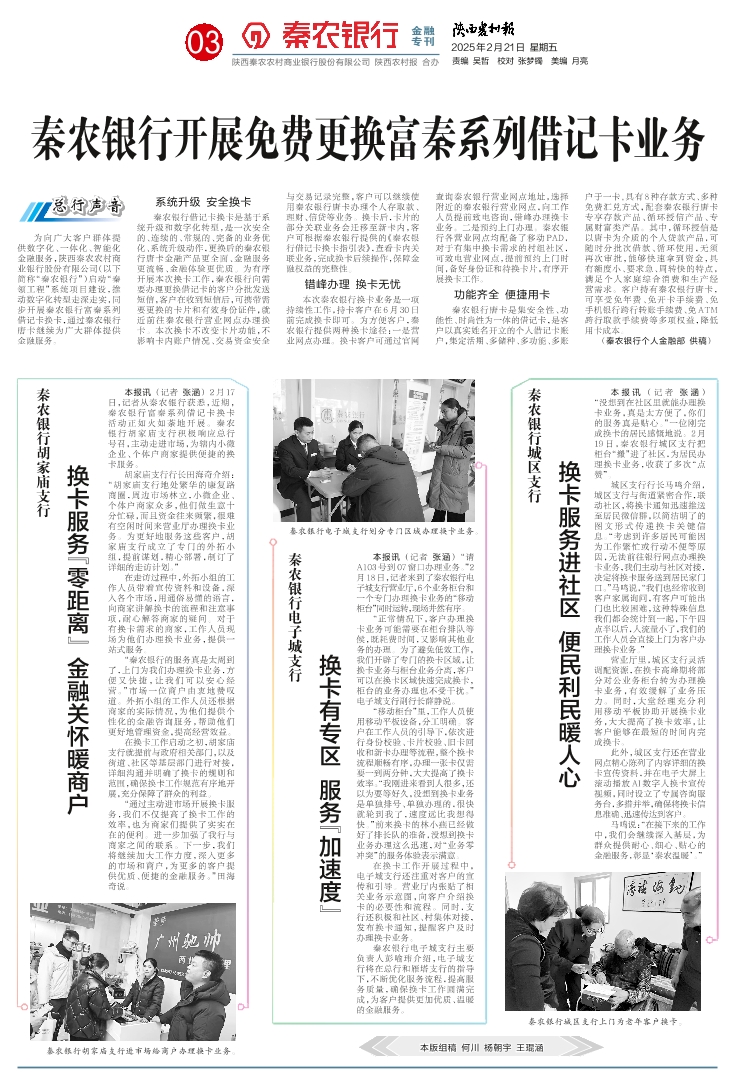 秦农银行开展免费更换富秦系列借记卡业务