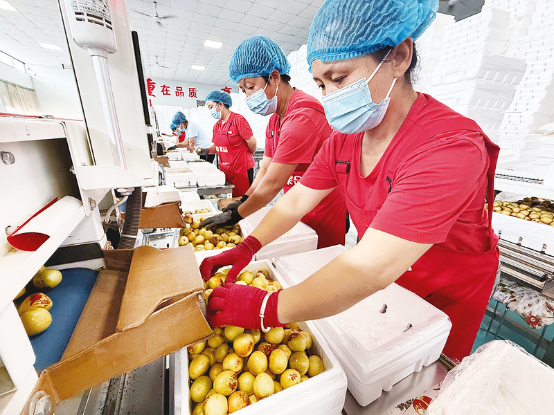 7月7日,大荔县一家果品专业合作社内一片繁忙景象,国内首条冬枣测糖分选线正在有条不紊地运作着。