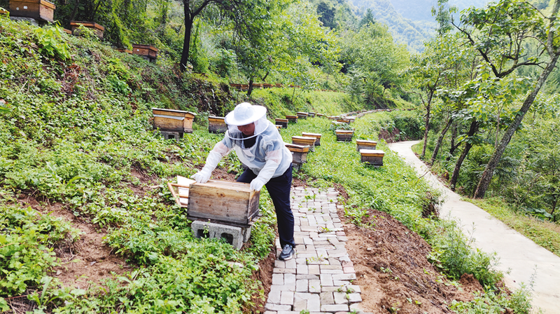 8月21日,在柞水县小岭镇岭丰村中华蜂养殖基地内,吴启明轻手轻脚地打开蜂箱,山花的清香混着蜂蜜的甜味在山间弥漫。这位与蜂为伴10多年的蜂农笑着感叹:“现在这50多箱蜂,每天稳稳能收50多公斤蜜。咱这山上的花真是一年比一年多,蜜的产量、质量都上去了。养蜂这‘甜蜜事业’,路越走越宽了。”