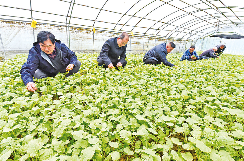 10月14日,在宁强县舒家坝镇宝珠观村育苗基地,县农技中心技术人员查看油菜生长情况,指导村民做好油菜育苗管理。