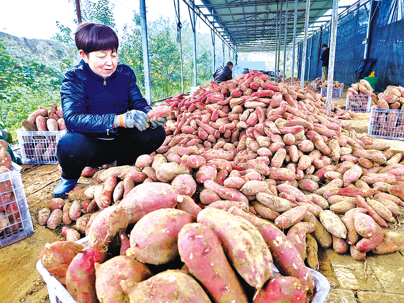 金秋十月,永寿县迎来采收季,红薯喜获丰收,村民抢抓降雨间隙,及时收获红薯。图为10月21日,永寿县监军街道永安村村民将红薯分拣装筐。