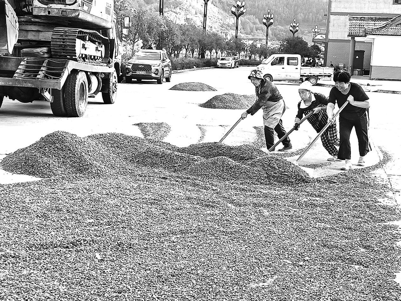 近年来,宁强县阳平关镇因地制宜发展中药材产业,建成中药材产业基地4300余亩,助力乡村全面振兴。图为10月15日,阳平关镇阳平关村村民抢抓晴朗天气,晾晒加工后的杜仲皮。