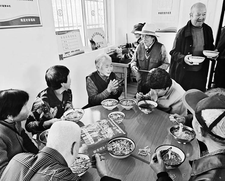 12月1日,在岐山县青化镇南武村互助幸福院餐厅,老人们围坐一桌吃午饭。