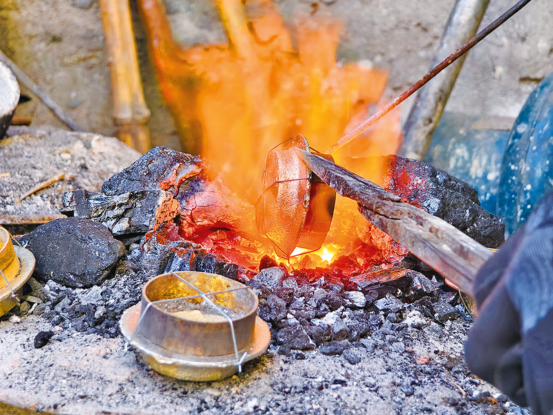 循声探去,脚步停在一间院落前,只见狭小的工作间里堆满铜、铁、铝等材料,羊角锤、铁钳、榔头等各式工具齐备,一旁的炭火烧得正旺。丁关举蹲在地上,专注地打磨铜料,一起一落间,铜壶雏形逐渐清晰。