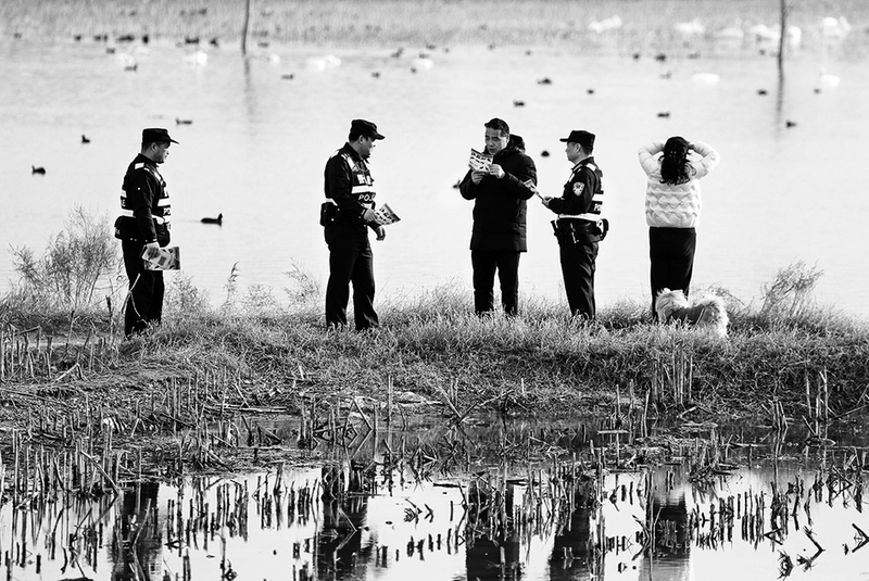 12月4日,在渭南市华州区柳枝镇北拾村河滩地,民警向群众宣传保护野生动物知识。