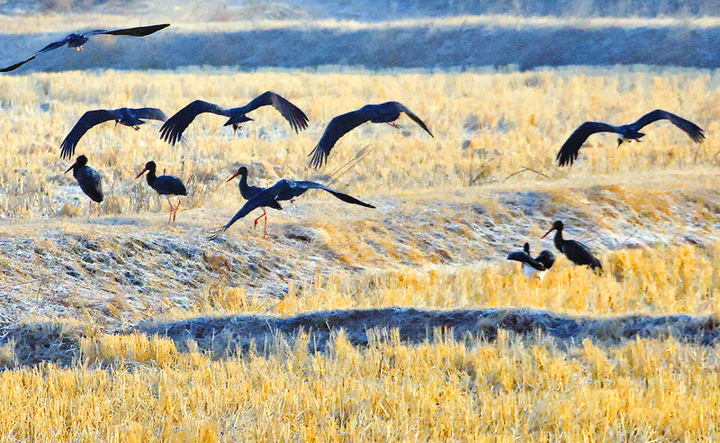 12月15日,在陕西黄河湿地省级自然保护区大荔段,国家一级重点保护鸟类大鸨、黑鹳集群栖息、翩跹起舞。