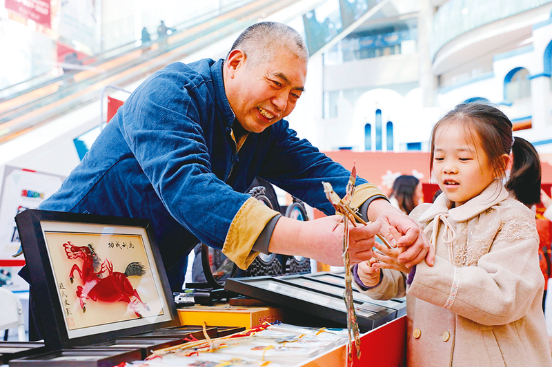 12月13日,西安市民乐园万达广场,工作人员正在向小朋友展示临渭草编文创产品。