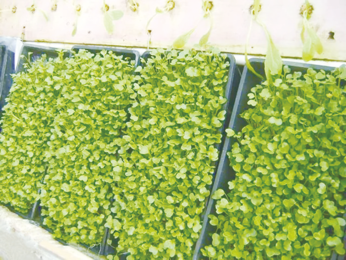 播种前先将育苗盘清洗干净、进行消毒,再铺上一层栽培基质,然后将种子均匀撒在育苗盘中的基质上(每盘播种100~150克)。播好种后,将育苗盘摆放到栽培架上即可。苗床要选择疏松、肥沃且排水性能良好的沙壤土地块,播前先要浇透水,然后采用撒播的方式将种子均匀地撒在苗床上(每平方米播种150~250克)。播好种后,覆盖一层1厘米厚的疏松细土。