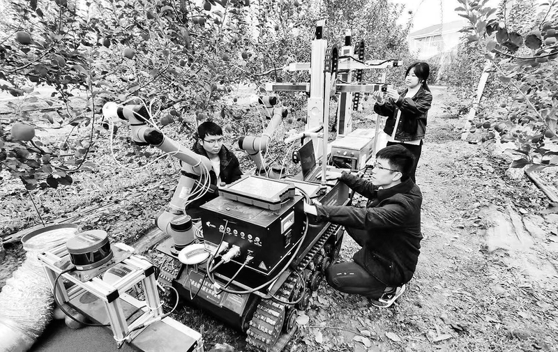 杨福增团队成员在记录苹果采摘机器人运行数据。(资料图)