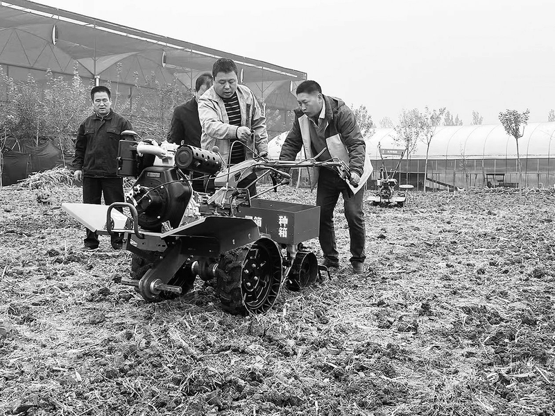李智国教授(右一)在调试农机。(资料图) 本报记者 张恒