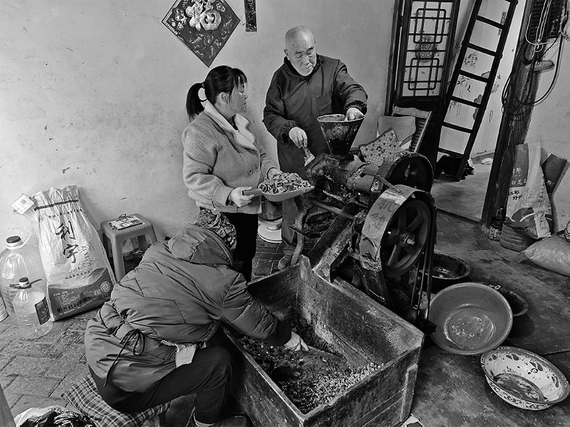 2025年12月26日,谷玉祥(右一)正在榨油。