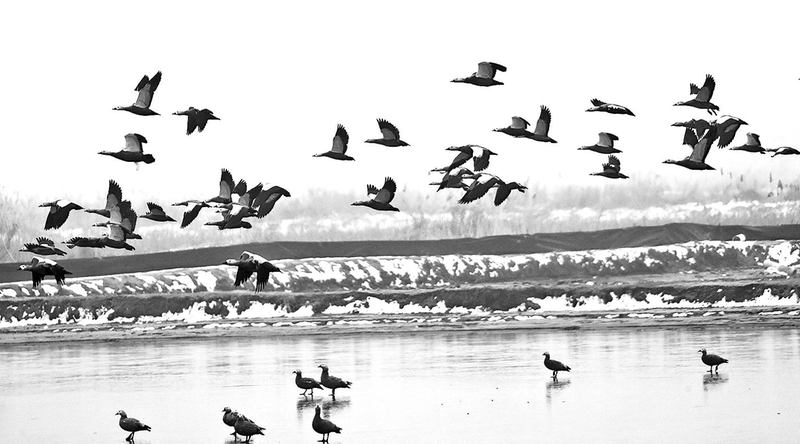 1月3日,陕西黄河湿地省级自然保护区大荔段滩涂迎来大批鸟类。它们或翱翔天际,或在冰滩觅食嬉戏,清脆鸣声回荡旷野,为静谧的雪后湿地增添生机,这里俨然成了名副其实的“鸟类天堂”。