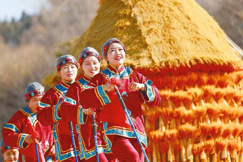 下图为:双泉村村民表演拐杖舞《凤凰岭下俏婆婆》。