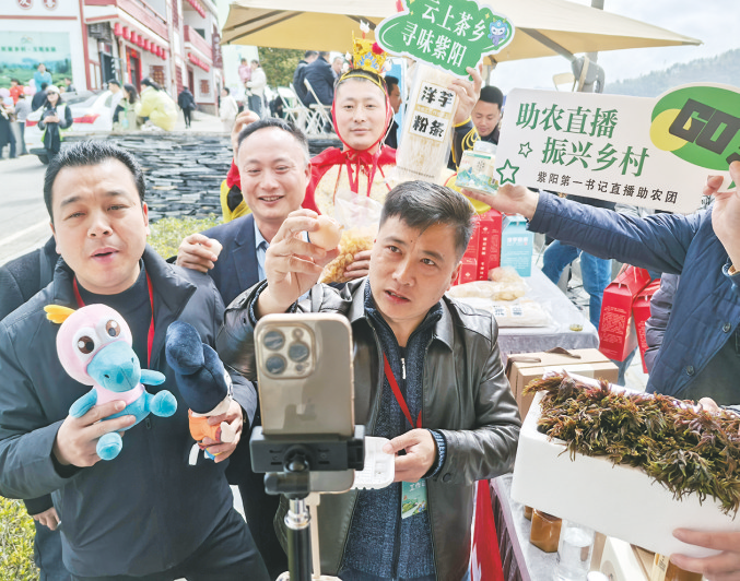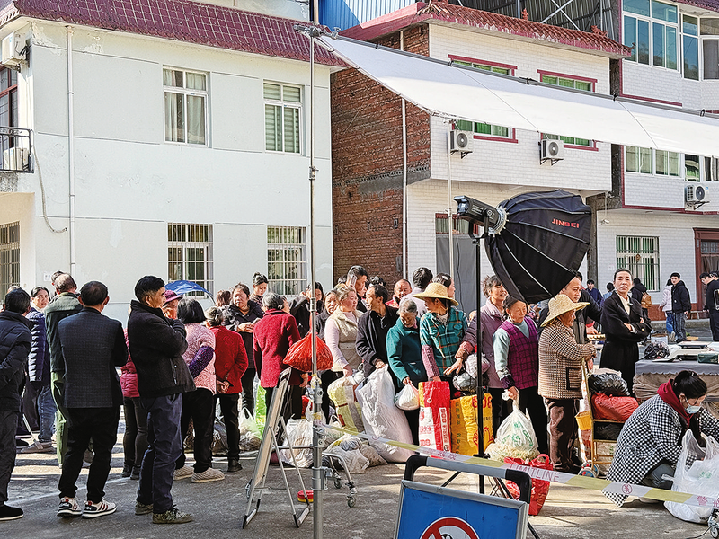 1月8日,余勇军(左二)正在镜头前介绍家乡好产品。