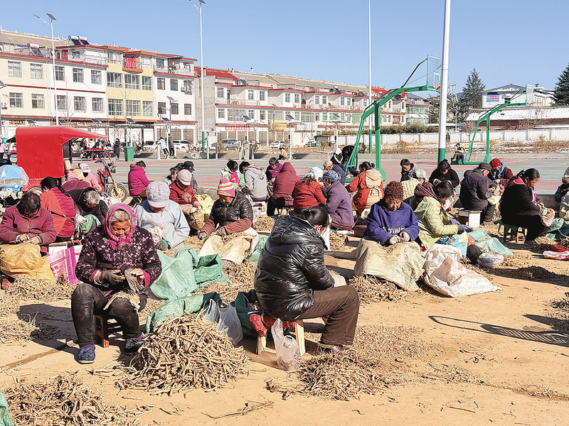 广场上刮桔梗的热闹场景,是古城镇延伸中药材产业链、提升产业价值的生动缩影。近年来,该镇立足桔梗、连翘、天麻等道地药材的种植传统与区位优势,以特色产业为抓手,推动中药材产业稳步发展。截至2025年底,全镇以丹参、连翘、桔梗等为主的中药材种植面积已达1.6万亩,形成规模化、多元化的种植格局。