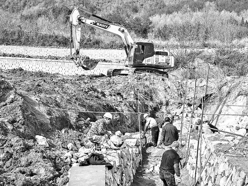 近年来,汉中市南郑区以小流域治理为抓手,统筹推进水土保持、生态修复与产业发展,让山水林田湖草沙一体化保护理念在秦巴腹地落地生根。图为1月14日,新集镇华安村岳岭小流域综合治理工程施工现场。