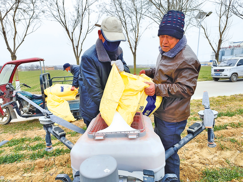 连日来,永寿县农业技术推广中心组织植保无人机给冬小麦示范田进行追肥作业,为今年夏粮丰产打好基础。下图为:村民给植保无人机添加尿素。