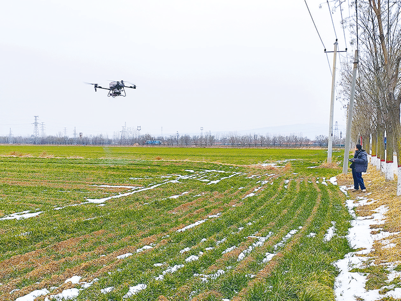 1月18日,在永寿县监军街道城关村冬小麦田间,植保无人机正在进行追肥作业(上图)。