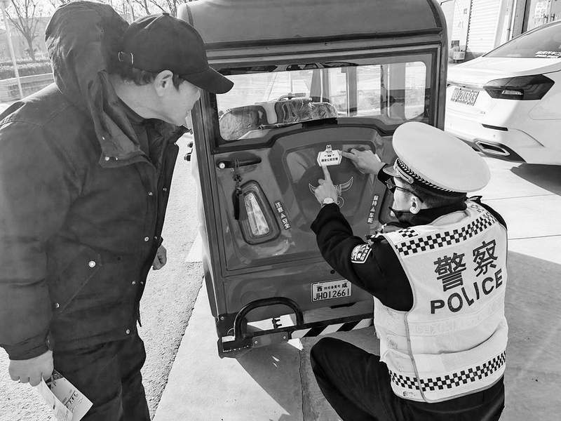 1月15日,西咸交管大队执勤五中队联合崇文镇政府工作人员、驻村网格员,走进樊家村、马庄村、唐李村,开展冬季交通安全警示教育活动,用“接地气”的宣讲为村民筑牢出行安全防线。图为民警给车辆贴反光贴。
