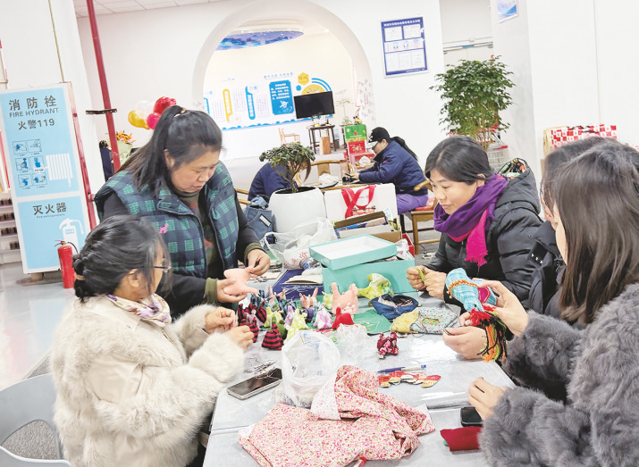 1月16日,韩城市欣怡坊手工专业合作社内,贾晓丽与绣娘围坐桌前,交流着布艺手工艺品。 本报记者 辛雨 文/图