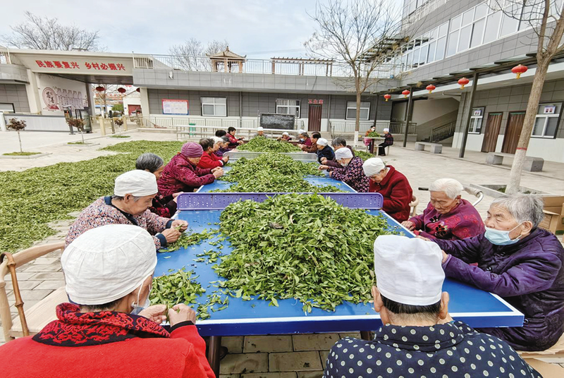 养老院里,老人们围坐一起挑拣金银花新芽里的杂物。(资料图)
