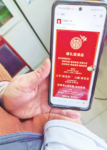 “咱也得跟上时代,发电子请柬邀请亲朋乡邻,不铺张、不攀比,把喜事办得文明又热闹。”提起儿子的婚事,徐周民眼角眉梢满是笑意。