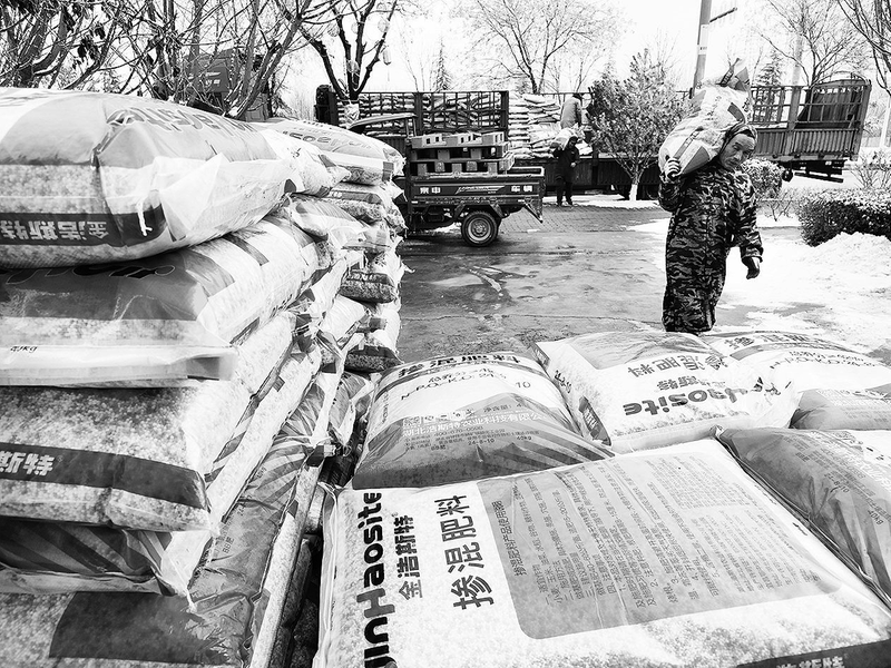 1月31日,永寿县旺农农业服务有限公司工作人员将化肥配送到监军街道城关村化肥销售点。