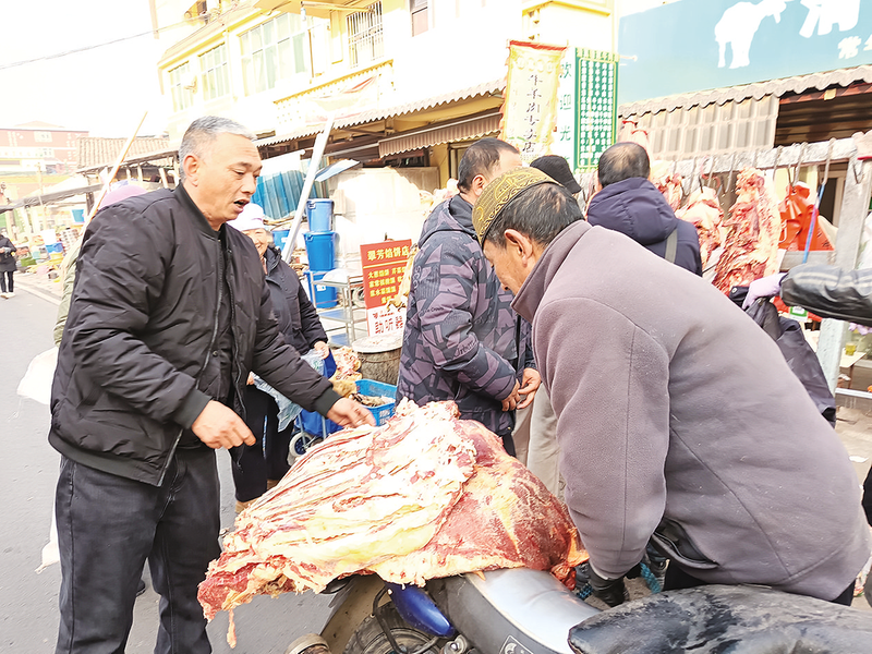 图为2月2日,在宁强县阳平关镇嘉陵江两岸农贸市场里,肉质鲜嫩的牛羊肉备受消费者青睐,群众争相选购,置办年货。 通讯员 边清学 摄