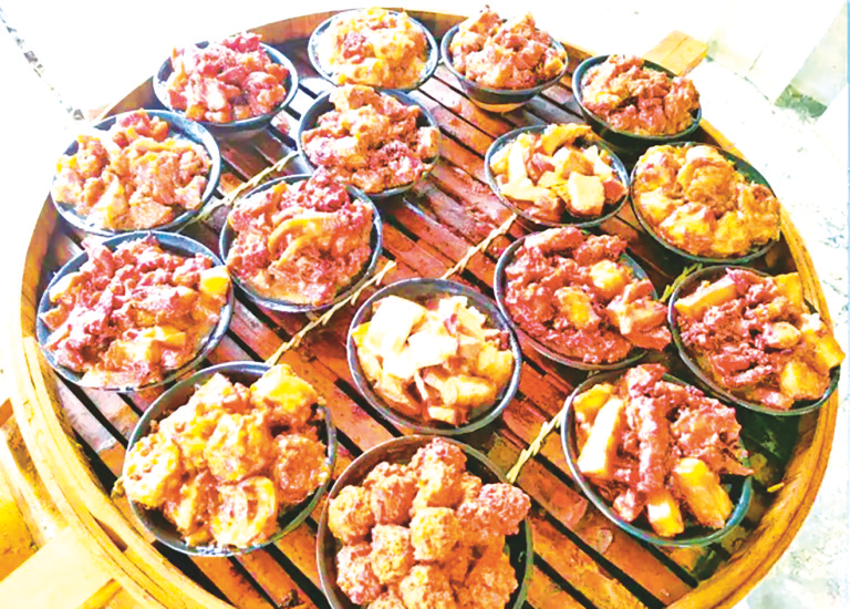 小时候,队里有羊圈,村民可寄养。爷爷每年养羊,腊八节前宰杀。羊肉饺子、包子、泡馍、羊杂碎,肉香在窑洞与院落里弥散,成了冬日里的温暖慰藉。我和妹妹负责剥葱、捣蒜、摘菜,年就在美食的制作中步步走近。爷爷做羊肉馅,先将肉切丁剁碎,胡萝卜擦丝切碎,加入葱姜末、盐、花椒面,再淋上熟油,顺时针搅拌,红白相间的馅料便拌好了。