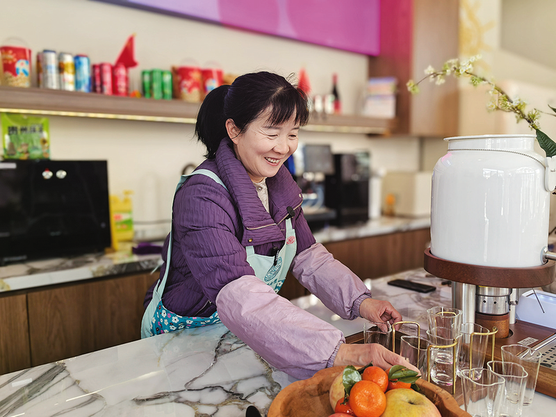 2月6日,王凤霞在前台打理,准备为客人沏茶。