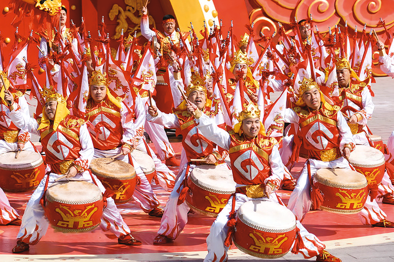 打头的是腰鼓队。几十个小姑娘,身着红衣、腰系红绸,斜挎着腰鼓,步子迈得轻盈,跳得老高,鼓槌上下翻飞,还不时变换队形,引得阵阵喝彩。腰鼓队后跟着扇子队,女人们穿着五彩绸衣,手捏花绸扇,在领队的指挥下,彩扇翻飞,恰似翩跹的花蝴蝶。