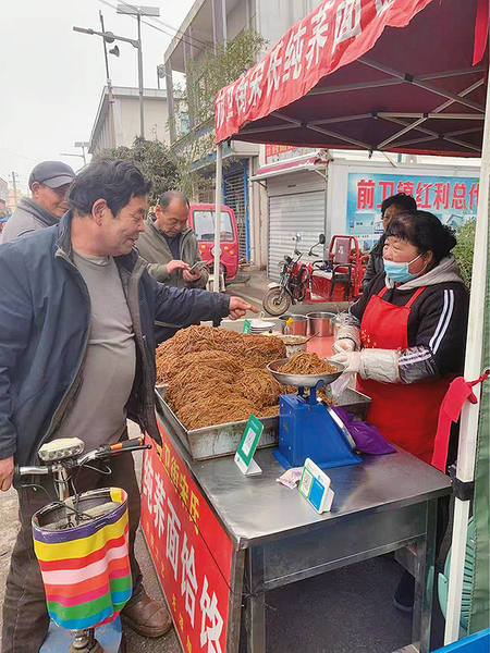 2月24日,在前卫镇乡村集市摊位前顾客正在购买特色美食。 王缠卫 文/图