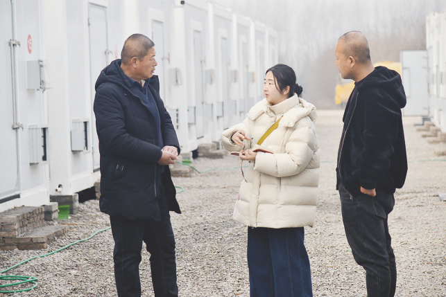 记者杨杰(中)向智慧方舱基地负责人薛驰(左)了解种植过程。