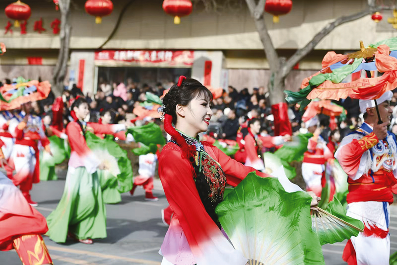 (下图)秧歌队员手持红绿彩扇,踏着欢快的节奏翩跹起舞。