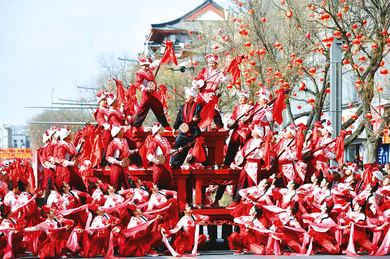 (上图)在多层舞台车上,表演者们击鼓奏乐,尽显非遗魅力。
