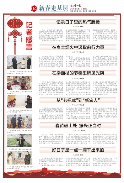 作为一名“三农”记者,这个新春,我的“主战场”依旧在田间地头、农家小院。没有高大上的会场,没有规整的发言稿,只有沾满泥土的运动鞋、记满收获的笔记本,还有乡亲们脸上的欢喜,这就是属于我的“新春限定”。